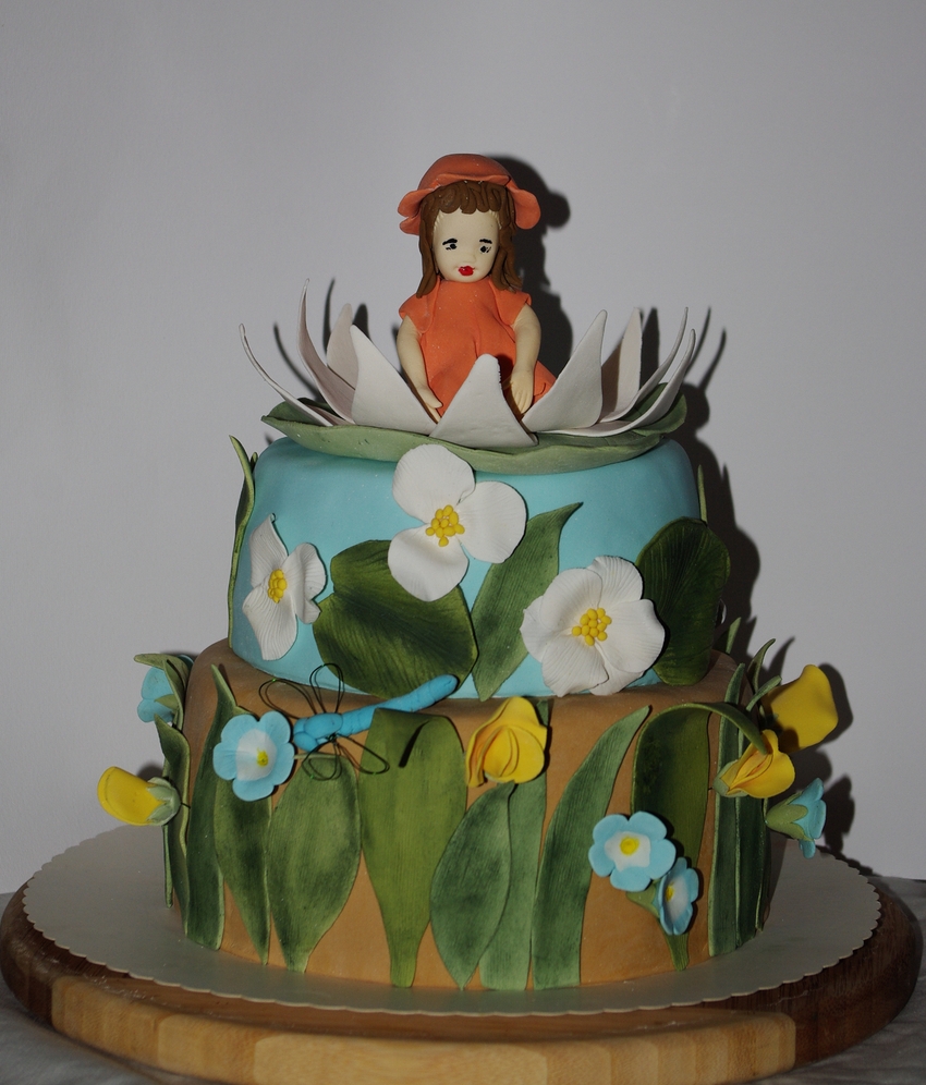 Цветята са правени под зоркото наблюдение на съпруга ми. С мащабирането твърде не се справих, но той твърди, че иначе са доста реалистични :). Жабешка воднянка (доста грозно име за такова красиво цвете според него :)), мехунка и водна незабравка са цветенцата изброени отгоре надолу.Сега малко ме е яд, че не го послушах да облека Палечка със зелена рокля, но оранжево в момента ми се струваше добра идея.